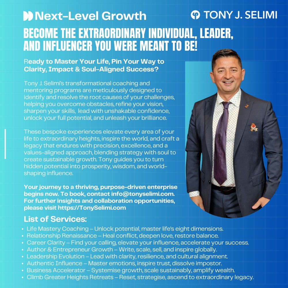 Tony J. Selimi is a globally recognised transformational life strategist, business growth consultant, and award-winning author of five internationally bestselling books, including A Path to Wisdom, #Loneliness: The Virus of the Modern Age, The Unfakeable Code®, A Path to Excellence, and his latest, Climb Greater Heights.